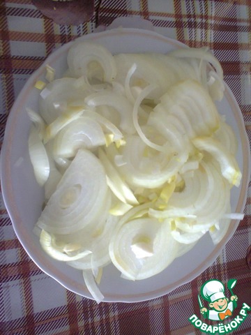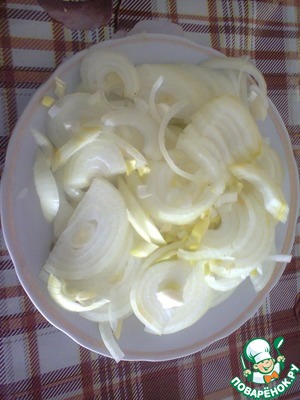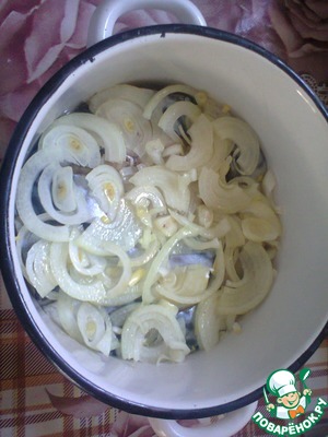 • Через 1 час каждый кусок рыбы промыть в проточной воде, промокнуть от влаги. Складывать в емкость, чередуя с луком, каждый слой лука поливать маслом и придавливать слегка рукой. Верхний слой должен быть луковым.