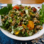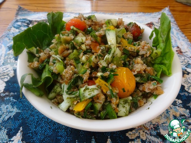 5. В одной емкости смешиваем зелень и овощи. Добавляем булгур. Солим, перчим. Заправляем растительным (в идеале - оливковым) маслом и соком из половинки лимона.