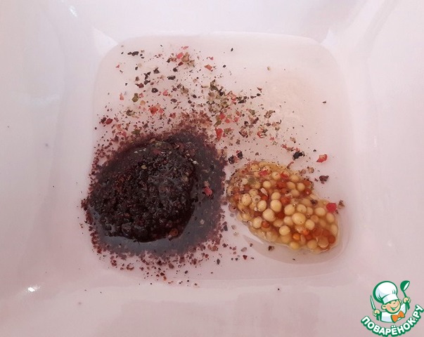 Делаем заправку. Берем масло оливковое, сахар, соль, перец черный молотый, сумах, горчицу зернистую.