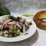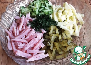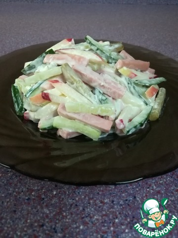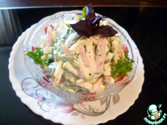 Вкусный и легкий салат! Для салата желательно использовать ветчину нежирных сортов (из лопатки свинины, из индейки, из курицы). А яблоки брать кислые или кисло-сладкие. Необыкновенное сочетание соленого и свежего огурчика. В результате получается изумительная гармония вкуса.