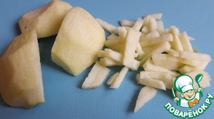 Яблоки очистить, вырезать серединку, нарезать соломкой.