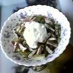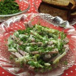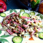 Я в такой салат добавляю вместо яблок (моё семейство не очень понимает вкус свежих яблок и мяса) красный сладкий перец и ещё очень нравится добавлять сыр. Замечательный простой рецепт