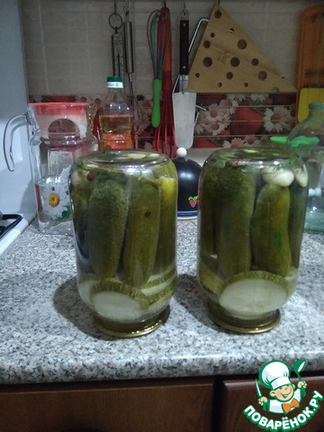 Спустя 10 минут с банок слить воду. Добавить уксус - по 3 ст л на 1,5л банку, залить кипящим рассолом. Прикрыть банки не плотно крышками и опустить в кипяток для стерилизации. Стерилизовать при активном кипении 15 минут. Затем плотно закрыть банки, перевернуть и оставить до полного остывания. Можно укутать в полотенце для медленного остывания.