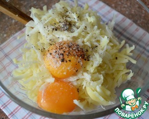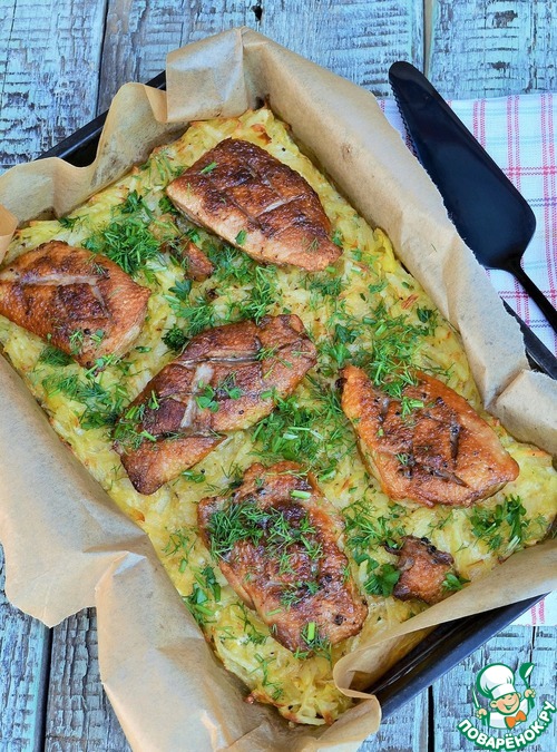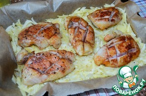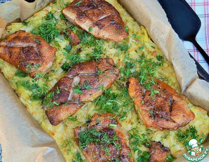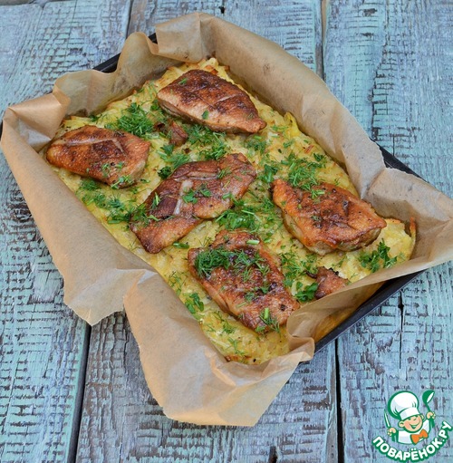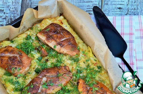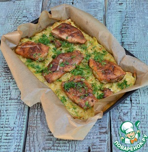 В противень, 28*18 см., выстелить бумагу для выпечки, смазать немного жиром от грудок и разложить картофельную массу.
