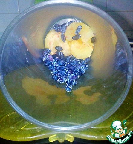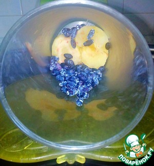 Кладем в чашу блендера остывшие яблоки и насыпаем кладезь витаминов - жимолость! Можно, естественно, взять другие, имеющиеся, ягоды, даже замороженные.