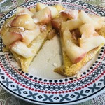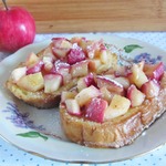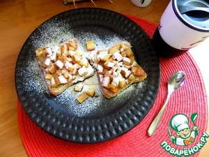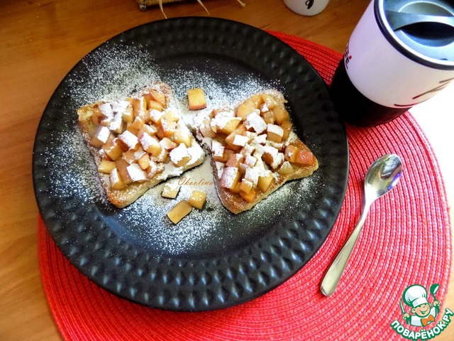 • Выкладываем на тарелку, в которой будите подавать. Сверху тостов раскладываем яблоки.