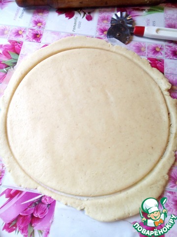 Раскатываем как можно тоньше, вырезаем формой ( в которой будем печь) круг.