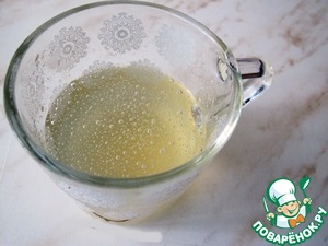 Размешать желатин с водой и оставить на 20 минут. Когда желатин набухнет, поставить на минуту в микроволновую печь, чтобы он слегка распустился.