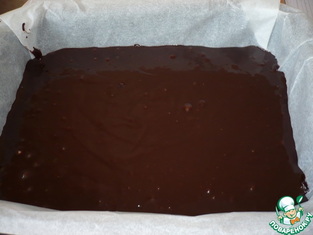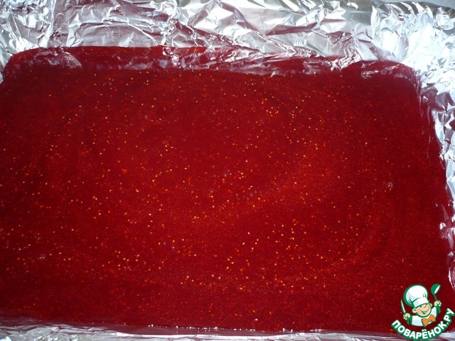 Затем наливаем мармеладную массу в форму застеленную фольгой. Размер формы 30х20 см.