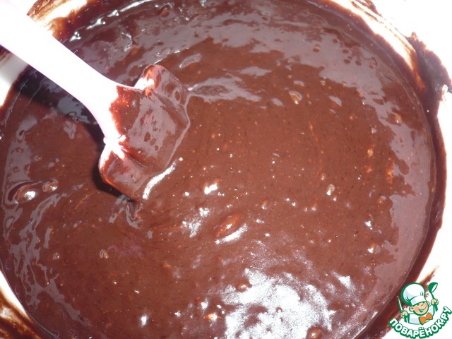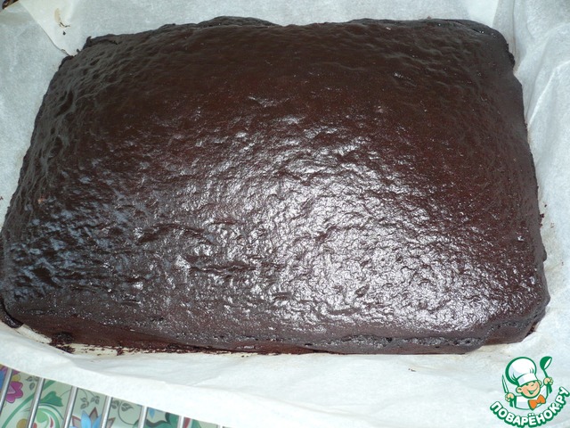 Форму для запекания (размер 25х18 см) застелить пергаментом и вылить приготовленную массу. (Если у вас круглая форма, то бока смазать маслом, а дно также застелить пергаментом. Из этого количества теста выйдет два коржа по 16-18 см).