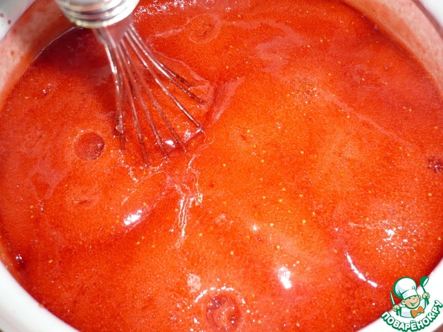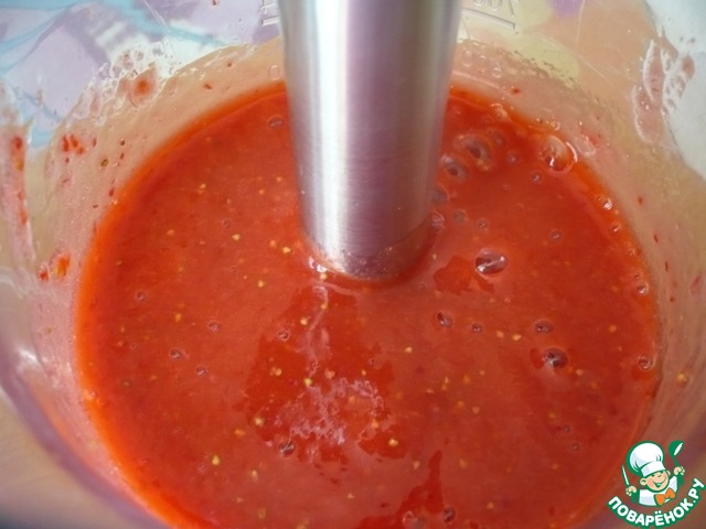 Приготовим клубничное пюре с помощью блендера. Готовое пюре налить в кастрюльку. Ставим на плиту и начнем нагревать.