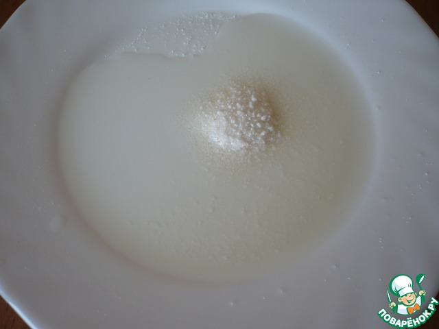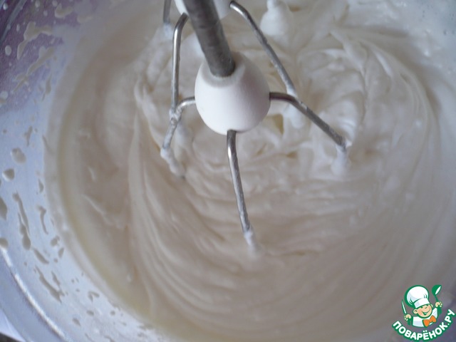 Теперь взбиваем крем. Для крема берем жирные сливки и сахарную пудру. Взбивайте миксером на максимальной скорости до загустения сливок.