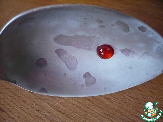 Чтобы проверить готовность мармелада, нужно сделать тест. (Для этого достаньте из морозильной камеры ложку, которую вы должны положить туда в начале приготовления мармелада). Капните каплю мармеладной массы. Через пол минуты капля должна загустеть и стать мармеладкой.