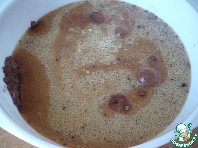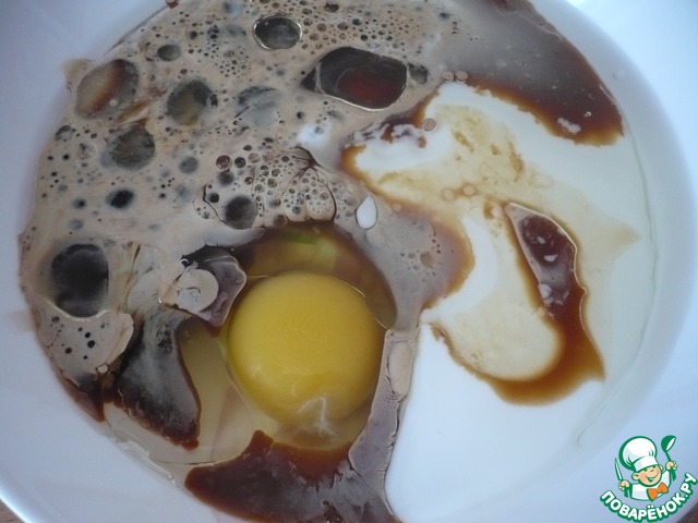 В другой миске соединяем кефир, одно яйцо, любое растительное масло, тёплый кофе (можно заменить просто водой или молоком).