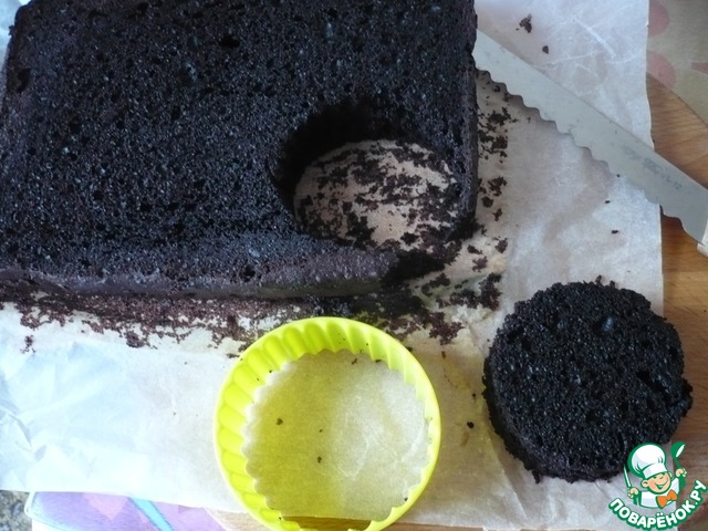 Верхушку у коржа можно немного срезать (если она поднялась неровно), чтобы коржи получились одной толщины. Я делала порционные мини-тортики. Поэтому взяла подходящее кольцо и вырезала коржики поменьше (бока коржей будут мягкими, поэтому их можно не покрывать кремом сбоку).