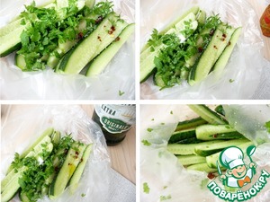 Сложить в пакет, добавить измельченную кинзу (у меня петрушка), добавить перец чили (у меня сушеный, взяла 1/2 ч. л.) -