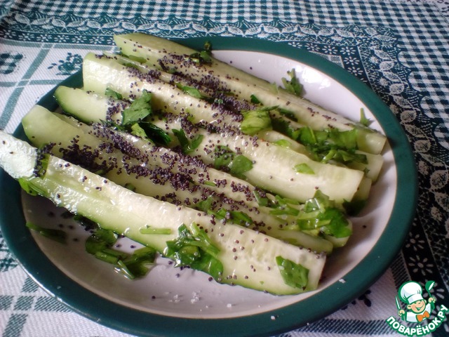 Переложить огурцы на тарелку, добавить щепотку мака.