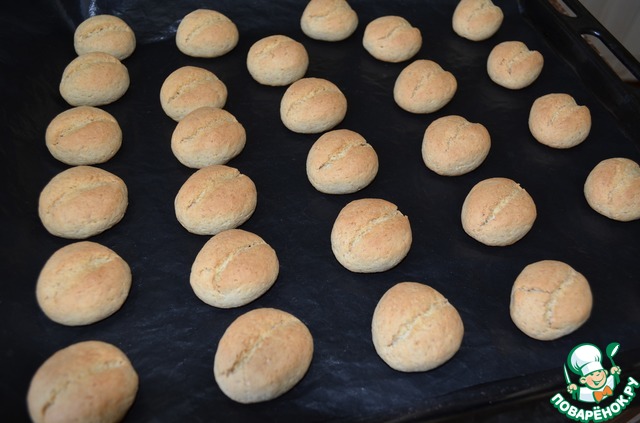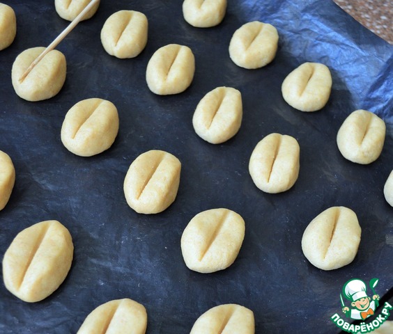 Сформовать печенье в виде зернышек, выложить на застеленный противень.