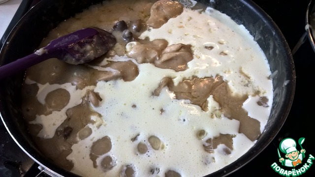 Добавляем загуститель в сковороды с курицей, постоянно помешивая, чтобы яйцо не свернулось. Остаточной температуры достаточно, чтобы смесь загустела.