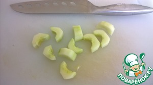 Очищаем огурец от кожи. Разрезаем вдоль пополам. Ложкой выскребаем семена и нарезаем на полукольца 0.5 см толщиной.