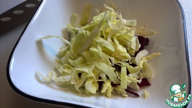 Капусту шинкуем тонко. По объему капусты должно быть примерно столько-же или чуть больше, чем свеклы