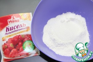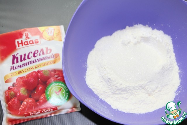 Отдельно все сухие ингредиенты: муку, сахар, ванильный сахар, соду, соль и кисель. Кисель тоже клубничный, он придаст нашим панкейкам клубничную нотку и пышность.