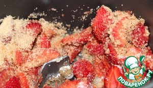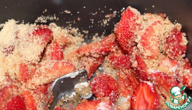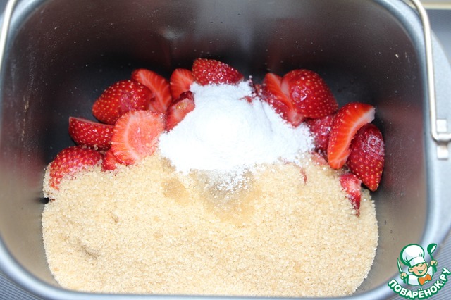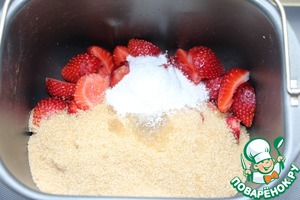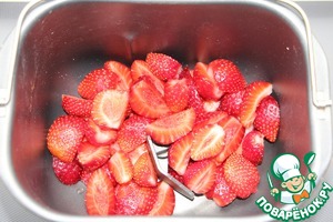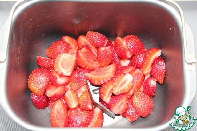 Итак, клубнику вымыть, удалить хвостики, разрезать крупные ягоды пополам. Поместить клубнику в ведерко хлебопечки...