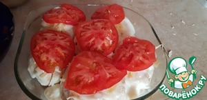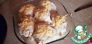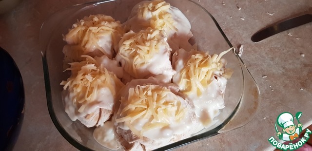 Залить соусом бешамель, каждлый конверт посыпать сыром.
