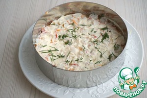 Салат мы будем укладывать слоями. Каждый последующий слой смазать не большим количеством майонеза и слегка присыпать укропом. При необходимости добавить соль.