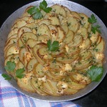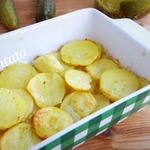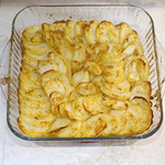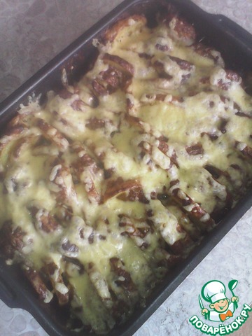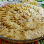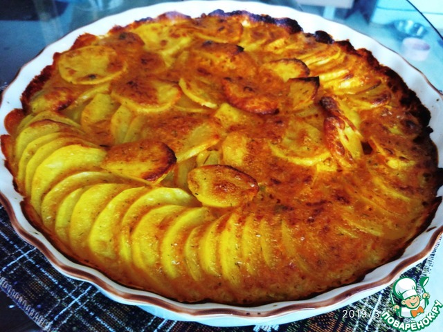 Смесь взбить вилочкой. Поместить в подготовленную смесь пластики картофеля. Покрыть смесью картофель. -