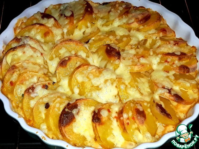 Далее готовый картофель посыпать тертым сыром и поместить форму в духовку еще на несколько минут для расплавления сыра.