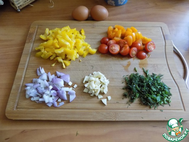 Приготовила овощи, порезав их вот таким образом. Если у вас будут крупные помидоры, то с них нужно снять кожицу предварительно.