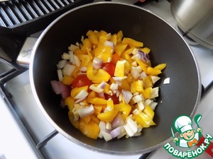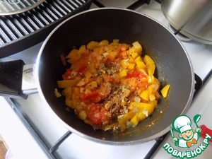 Посыпала овощи паприкой, жгучим перцем красным, перемешала и добавила смесь специй. Опять перемешала и потомила с минуту овощи.