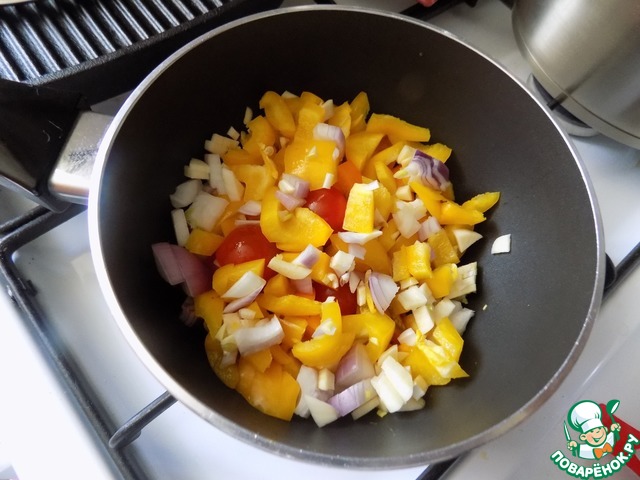 Понадобится сковорода или сотейник с толстым дном и желательно антипригарный. Я взяла сотейник небольшой. Завтрак делаю только себе и мне его достаточно на 2 яйца. В холодный сотейник выкладываем овощи и ставим на огонь. Оставляем зелень на потом. Нагреваем сотейник и овощи дадут сок, тушим их до готовности, это быстро минут 5-7. Если жидкость быстро испарится, а овощи ещё не готовы, то подливаем немного воды.