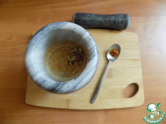 В ступке разбила зёрнышко кардамона и кусочки лаврового листа, добавила корицу (у меня молотая) и свеже-молотый чёрный перец. Соединила.