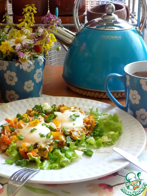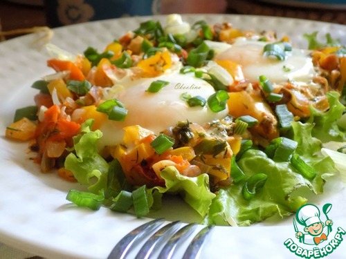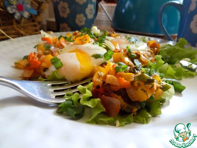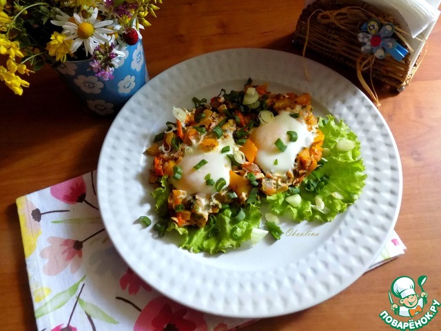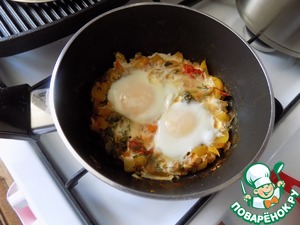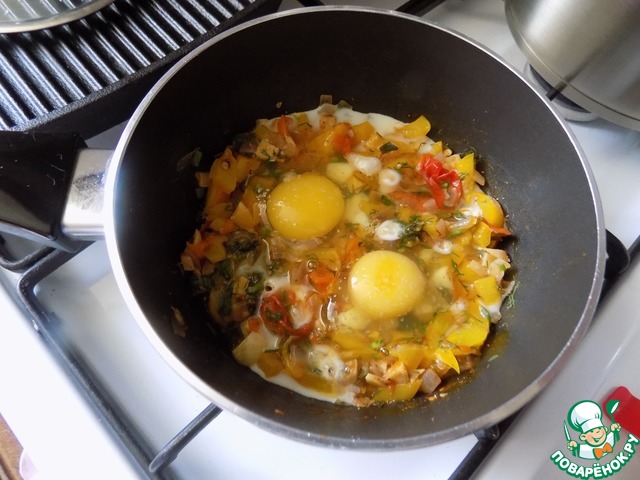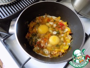Сделала 2 углубления в овощах и аккуратно разбила и поместила в них яйца. Сверху солим по вкусу. Я солила совсем немного.