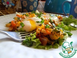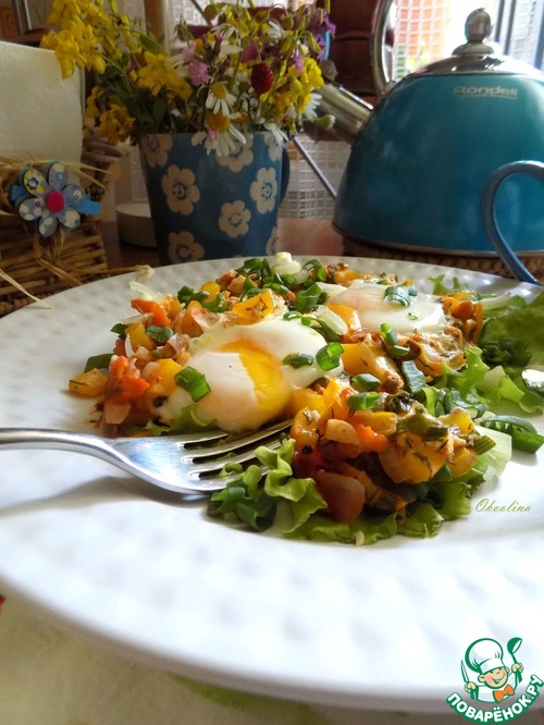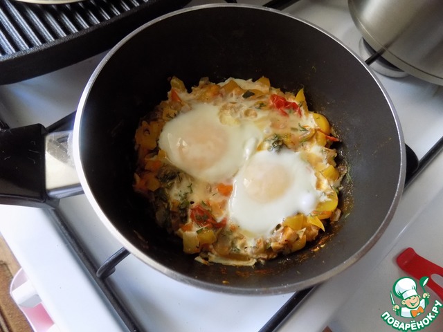 Яйца готовим так, чтобы желток оставался растекающимся. Мне так вкусней. Вы можете делать по своему вкусу. Если вам нужен крутой желток, то накройте сотейник крышкой, он так быстрей сделается.