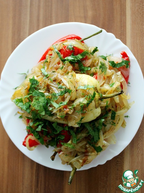 По этому же принципу можно приготовить сладкие перцы, они так же хороши к мясу, птице, шашлыку.