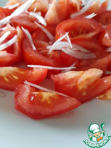 Помидоры нарезать дольками, лук -Шалот тонкими перьями.