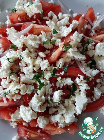 На помидоры выложить сыр, нарезанный кубиками или размятый вилкой на разные по величине кусочки. Посыпать мелко- рубленной мятой (я использовала 2 маленьких листочка)