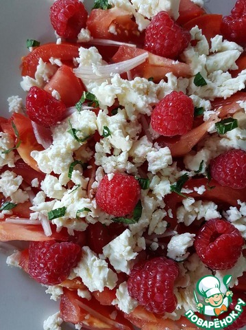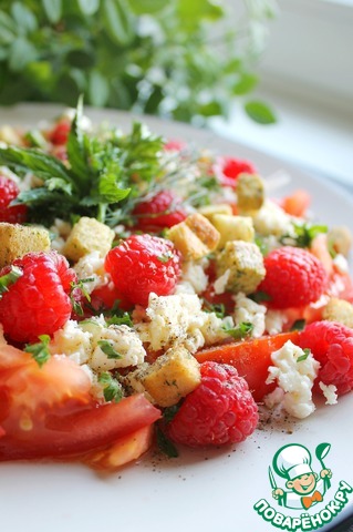 Этот рецепт необычного для меня салата я увидела на немецком кулинарном сайте. Делюсь с любителями экзотики. А если для вас малина совершенно несочетаема с овощами и сыром, то её (и мяту) смело можно убрать из ингридиентов и наслаждаться помидорным салатом с крутонами и сыром.