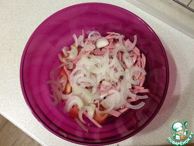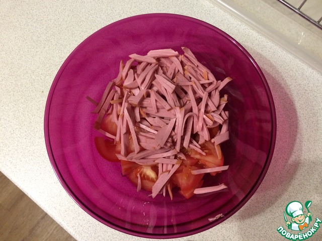Сардельку (немного вареной или копченой колбасы, сосиску, ветчину или мясо варено-копченое-в общем то, что есть у вас в холодильнике) нарезаем соломкой. Очень вкусно, если эта составляющая салата немного подкопченная, у меня как раз такая сарделька.