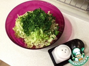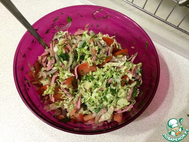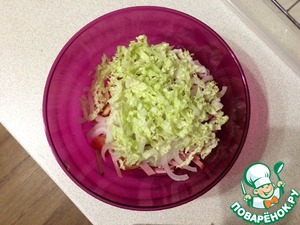 Пекинской капусты 6 больших листов (или маленьких больше) моем, вырезаем серединку, нарезаем.