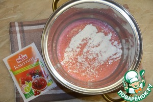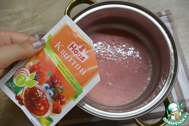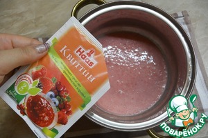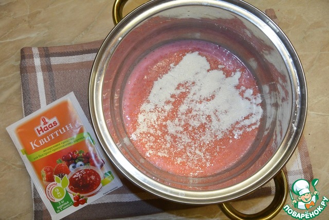Ягодное пюре поместить в кастрюльку. Добавить желирующее средство пектин "Квиттин" от ТМ "НААS" и