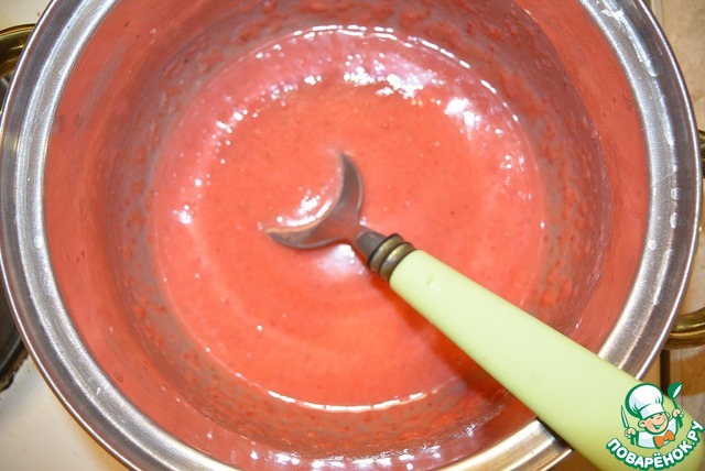 Жидкость довести до кипения, постоянно помешивая. Как только масса сильно закипит, добавить (при помешивании) соответствующую дозу сахара и продолжать варить. Поле того, как джем снова начнет кипеть, продолжать варить 5 минут при постоянном помешивании.