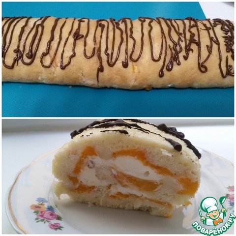 Затем аккуратно развернуть рулет и смазать поверхность пласта теплым (то есть не из холодильника!) творожным сыром. Оговорюсь. Рулет получается умеренно сладким, поэтому сладкоежки могут присыпать творожный сыр сахарной пудрой по своему вкусу или заранее смешать ее с сыром. Нам же хватает сладости самого бисквита, абрикосов и шоколадного декора. Мы не сладкоежки.
