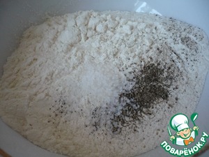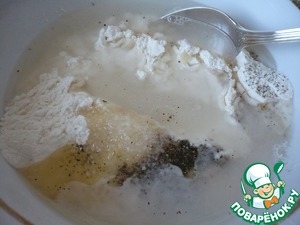 В смесь муки, соли и перца добавить оливковое масло и воду. Все хорошо перемешать.