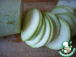 Вымыть кабачок и нарезать тонкими ломтиками.