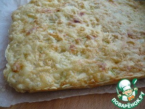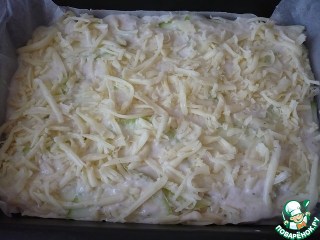 Противень застелить бумагой для выпечки, выложить тесто с кабачками и равномерно распределить кабачки и тесто по противню. (Размер формы 30х25).