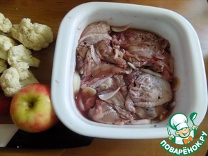 Какое взять мясо не принципиально. Берите любое на свой вкус. Я взяла куриные бёдра. Замариновала их на 40 минут. Посолила, поперчила, положила чеснок и лук, залила гранатовым соком. Очень мы любим маринад с ним. За 40 минут пару раз перевернула.
